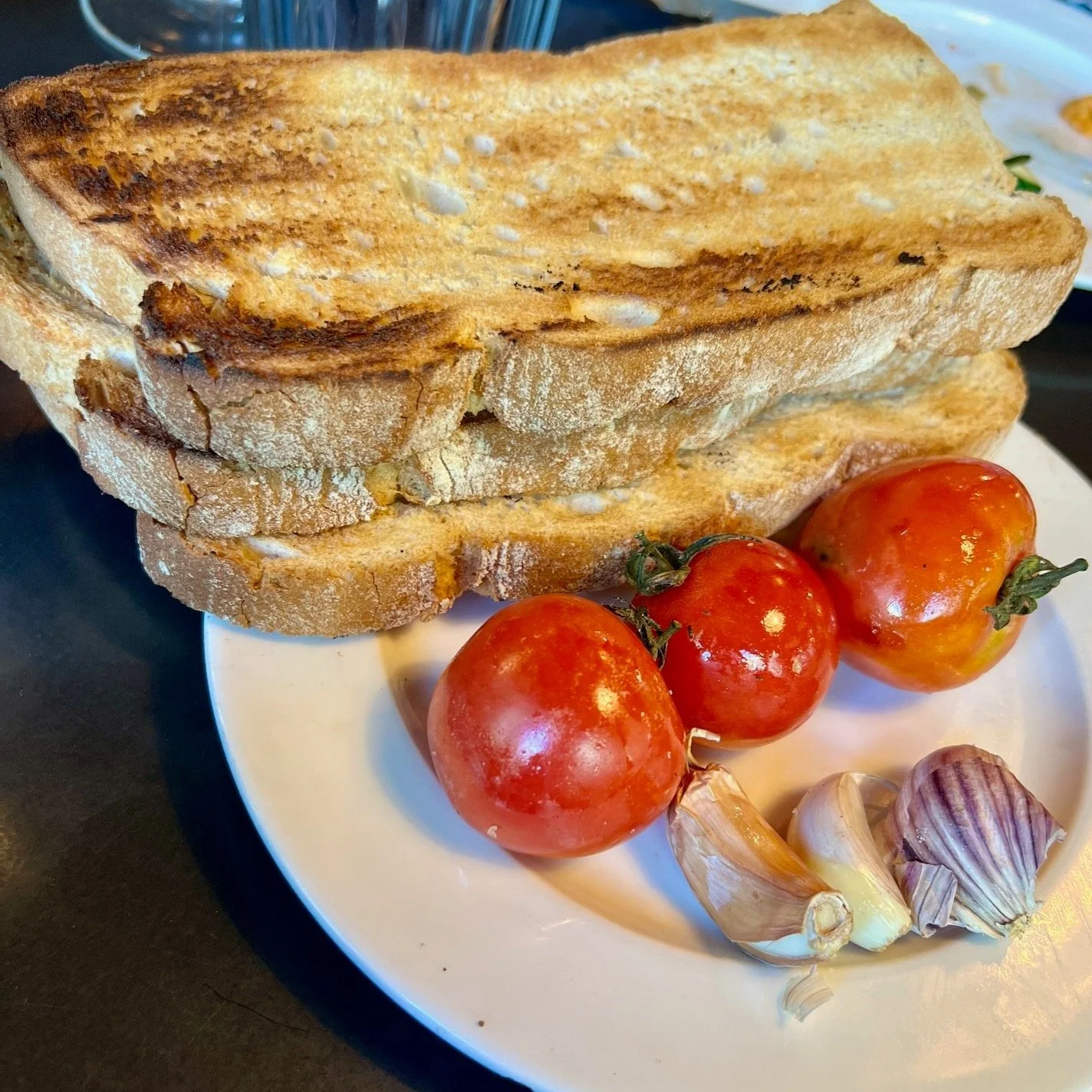 To prepare pan con tomate, raw garlic is rubbed onto crusty bread, then a slice of ripe tomato is rubbed on top. Top it off with a drizzle of fresh Spanish olive oil, and you have an unassuming dish that bursts with flavor and is irresistible, bite after bite.