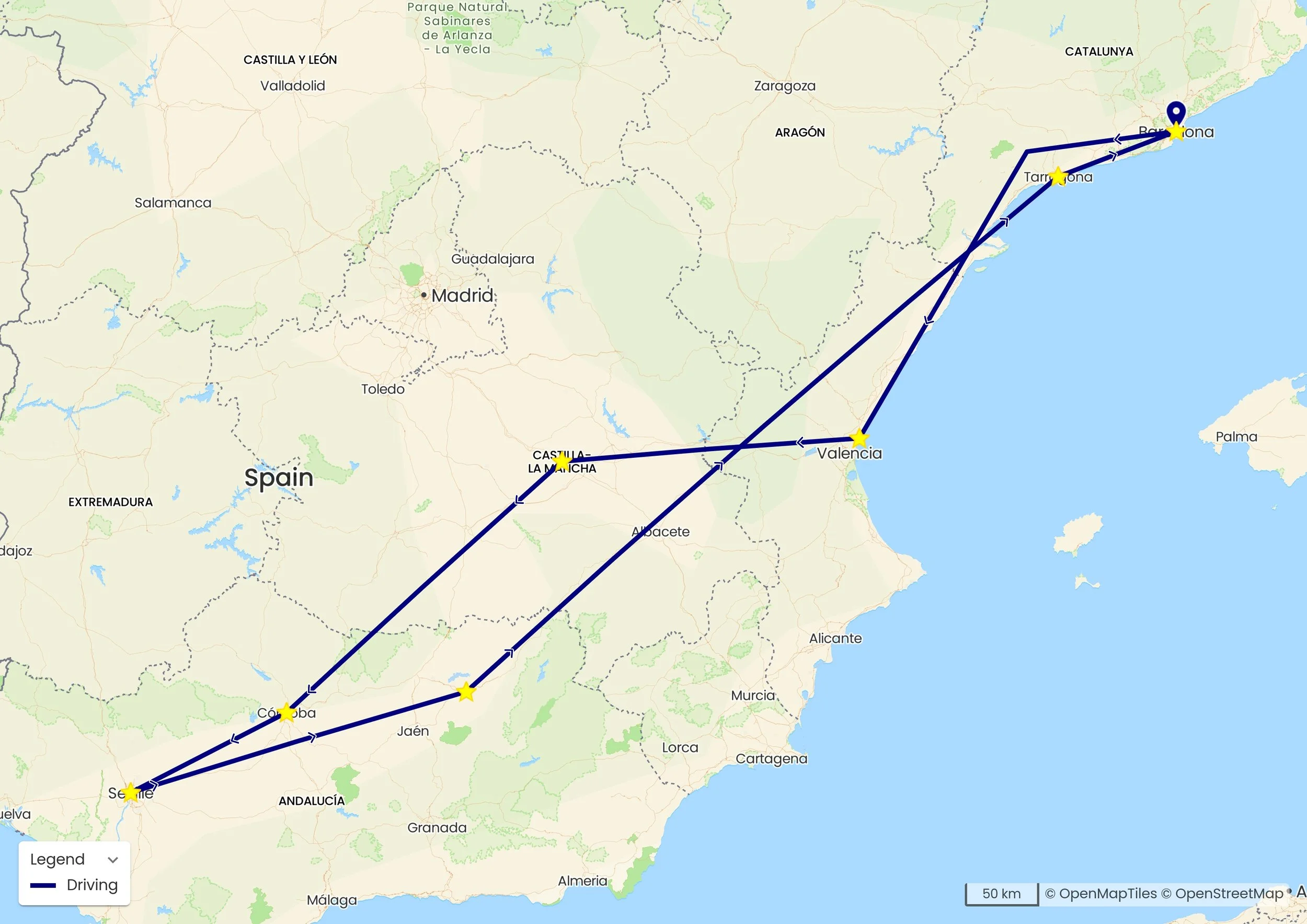 Destinations on the road trip from Barcelona to Seville